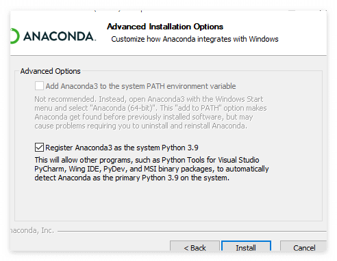 아래 이미지에서는 하나만 체크되어 있지만 아나콘다 환경변수를 자동으로 설정하고 싶다면 둘 다 체크한 뒤 설치하자.